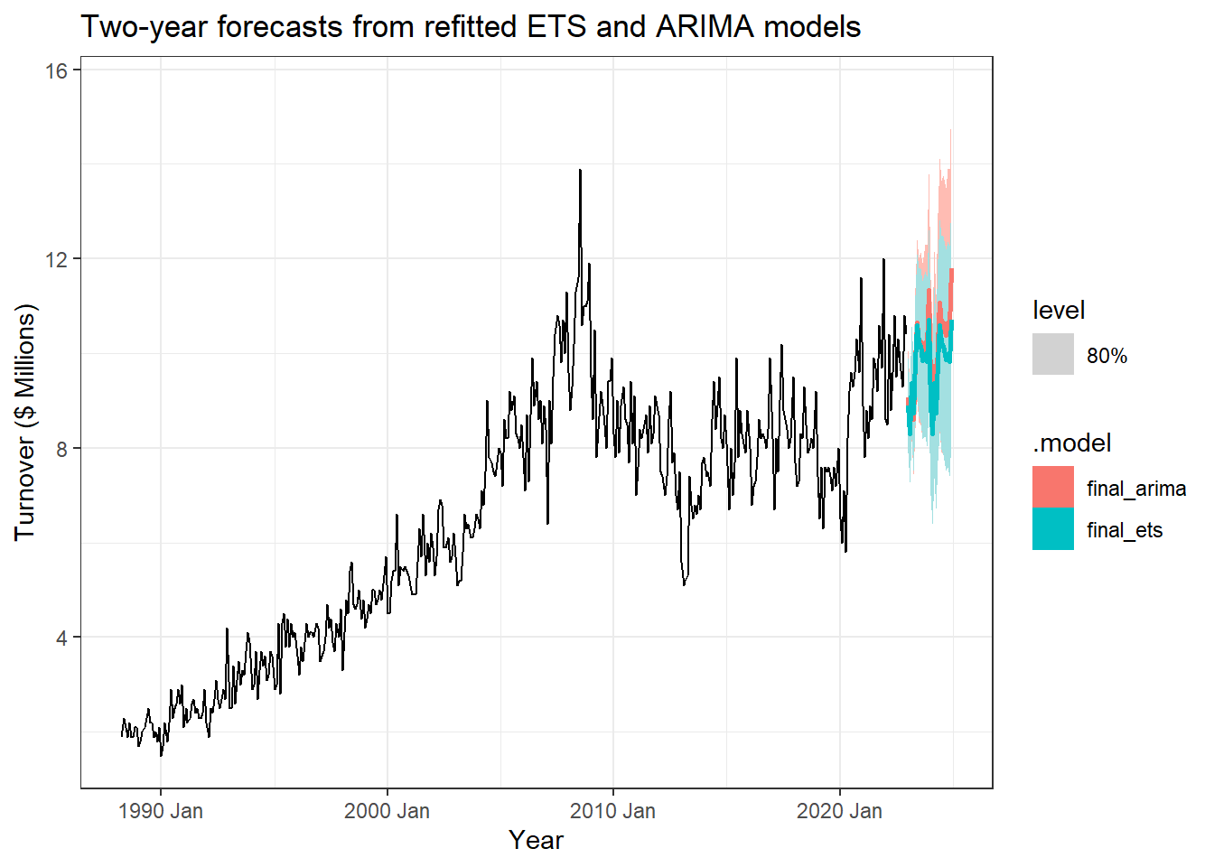 Figure 12 shows two-year ahead forecasts from the refitted ETS and ARIMA models, along with 80% prediction intervals. Both models project a continuation of recent trends and seasonal patterns, while differing in the degree of forecast uncertainty. The ETS forecasts remain relatively smooth and constrained, whereas the ARIMA forecasts allow for a wider range of possible outcomes, reflecting their sensitivity to recent variability.