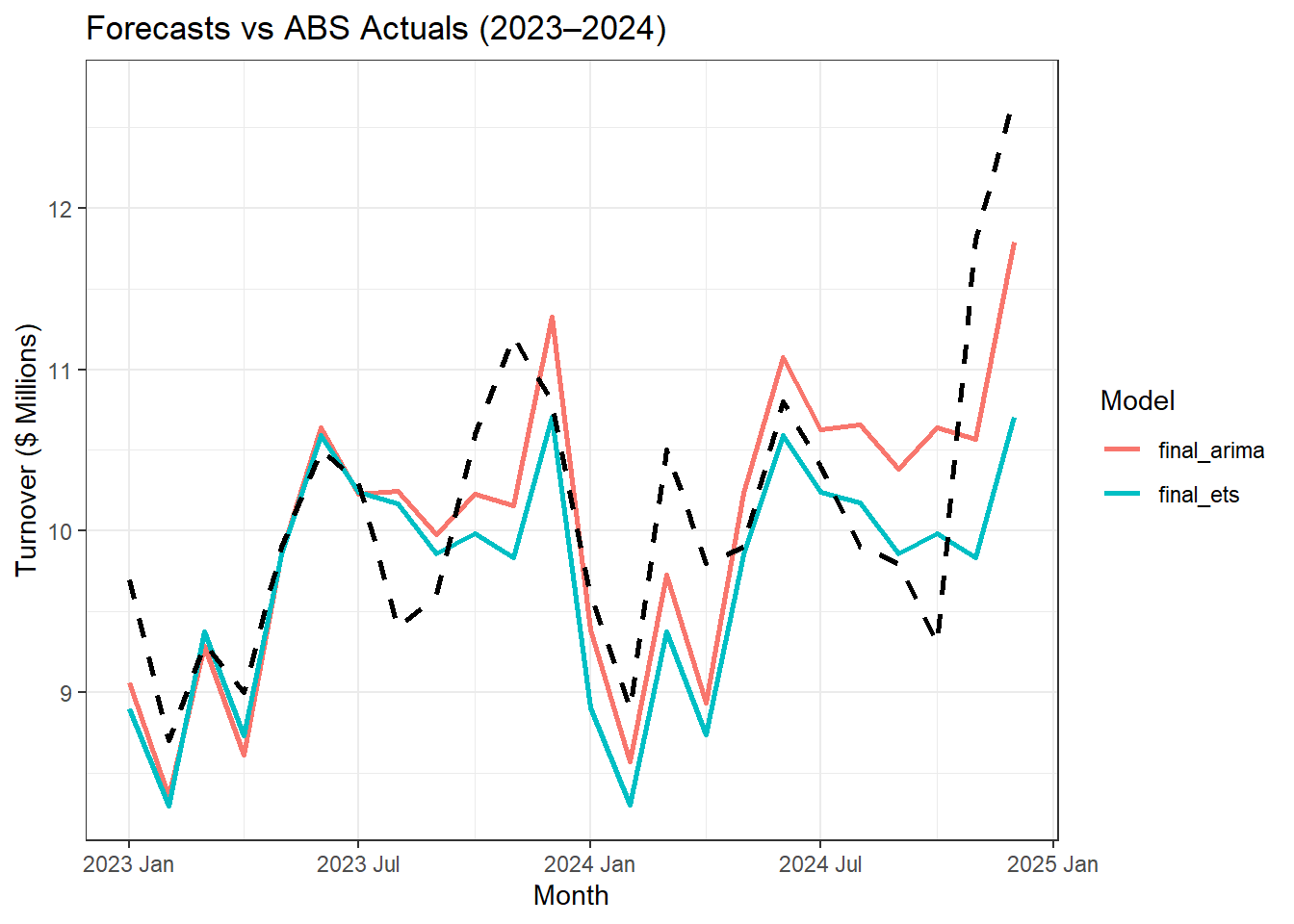 The ARIMA model, in contrast, is more reactive to recent movements in the data. This responsiveness allowed it to outperform ETS in terms of forecast accuracy when evaluated against realised ABS data for 2023–2024. That said, its forecasts are less smooth and its behaviour can be harder to interpret, especially when multiple autoregressive and moving average components interact. While ARIMA achieved better numerical accuracy in this case, neither model fully captured all short-term fluctuations in the series, reflecting the inherent noise and complexity of retail turnover data.