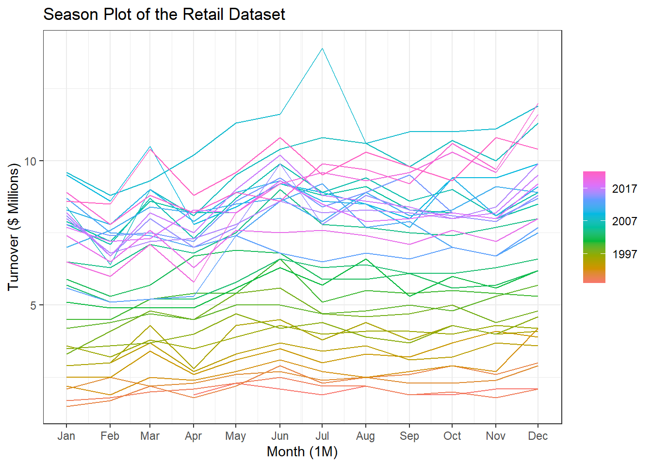 The seasonal plot in Figure 2 highlights strong and consistent seasonal patterns across years. Turnover tends to peak in June and December, while lower values are commonly observed around February and April. The regular repetition of these patterns supports the presence of true seasonality rather than irregular cyclical effects. Although the exact drivers are not directly observed in the data, these patterns may be associated with factors such as end-of-financial-year spending, holiday periods, and seasonal changes in consumer behaviour.