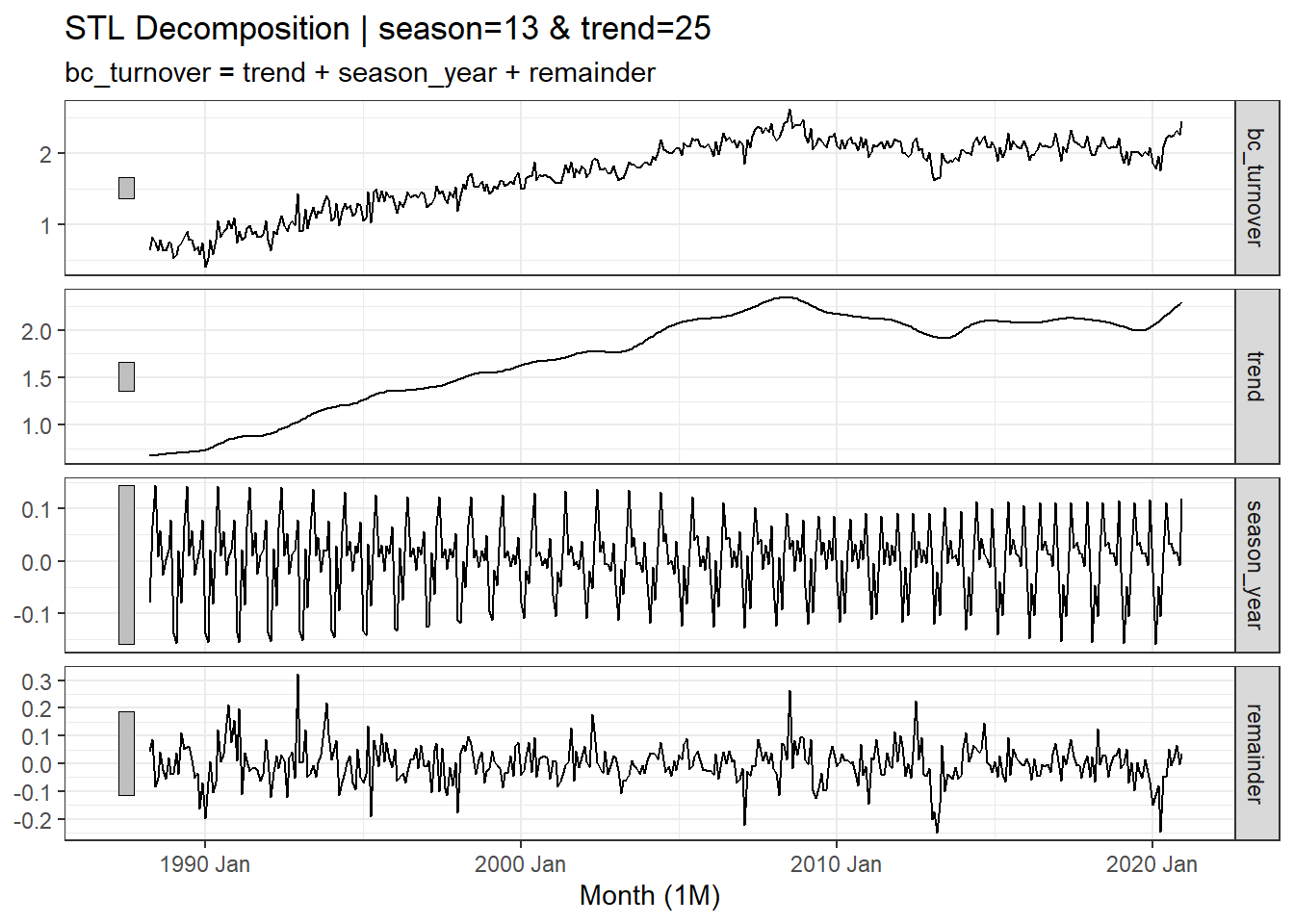 Because the series spans multiple decades, STL parameters are adjusted rather than relying on defaults. The seasonal window is set to 13 to allow the seasonal component to vary smoothly while still reflecting an annual cycle, which is appropriate for monthly retail data where recurring patterns such as end-of-financial-year and holiday periods are expected. The trend window is set to 25 to capture medium-term movements (roughly two years), allowing the trend component to reflect gradual shifts associated with changing economic conditions in the Northern Territory.