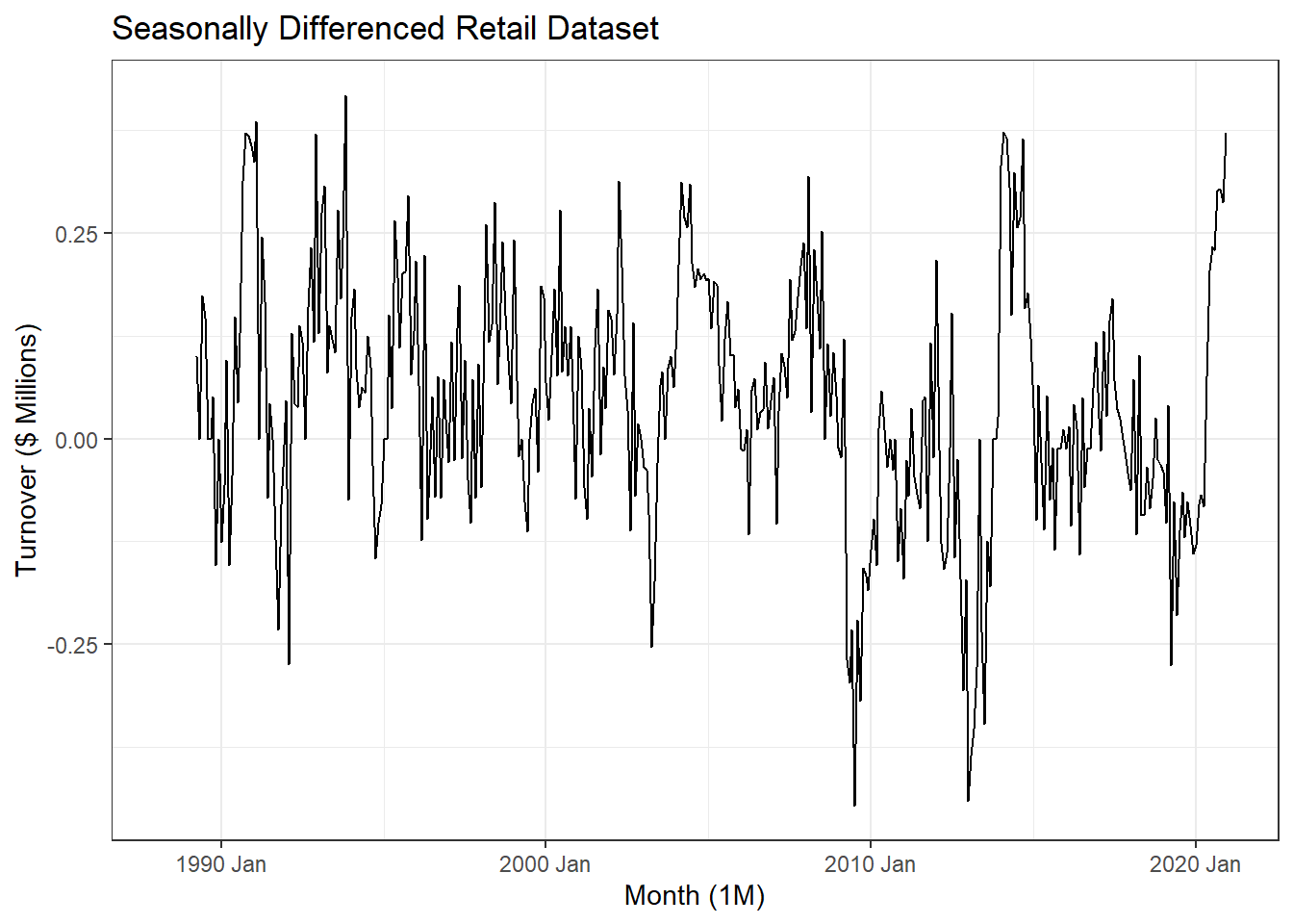 The time series plot in Figure 1 shows a clear upward long-term trend, indicating sustained growth in retail turnover over the sample period. Seasonal behaviour is also evident, with fluctuations that increase in magnitude as the level of the series rises, suggesting multiplicative seasonality. A pronounced increase in turnover is observed between approximately 2007 and 2009, which likely reflects the effects of the Northern Territory mining boom during that period. Following this, turnover declines sharply post-2010, potentially linked to the global financial crisis and the subsequent slowdown in mining-related economic activity.