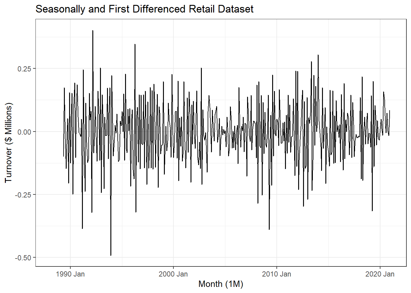 This progression is also reflected visually. The seasonally differenced series shown in Figure 6 no longer exhibits clear seasonal patterns, but still displays some residual structure. Applying an additional first-order difference yields the series in Figure 7, which fluctuates around a constant mean with no obvious trend or seasonality, consistent with a stationary process.