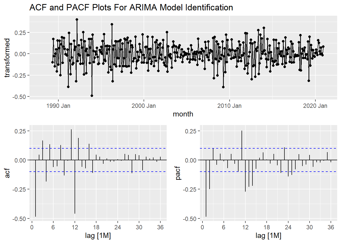 Overall, these results indicate that one seasonal difference and one regular difference are sufficient to achieve stationarity, providing an appropriate foundation for ARIMA model identification in the next section.